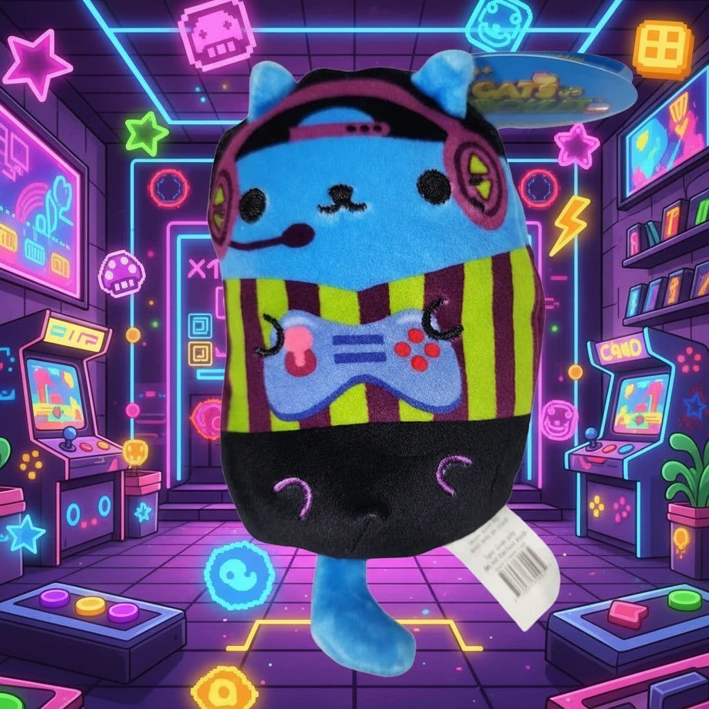 Level up your display with Gamer Kitty from Cats VS Pickles! 🎮🐱 This playful plush features a cozy, rounded build with expressive stitched details and a gamer-inspired vibe that gives the character a fun, competitive personality. Compact and soft, it fits neatly on shelves, desks, or alongside the rest of the series.