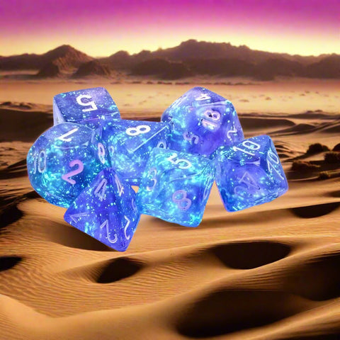 Unleash the magic of the night with the luminary resin dice set in purple and white! This 7-piece set features a mystical blend of deep purple resin and bright white numbers, creating a striking contrast. But the real enchantment begins when the lights go out—these dice glow in the dark, turning every roll into a luminous spectacle.