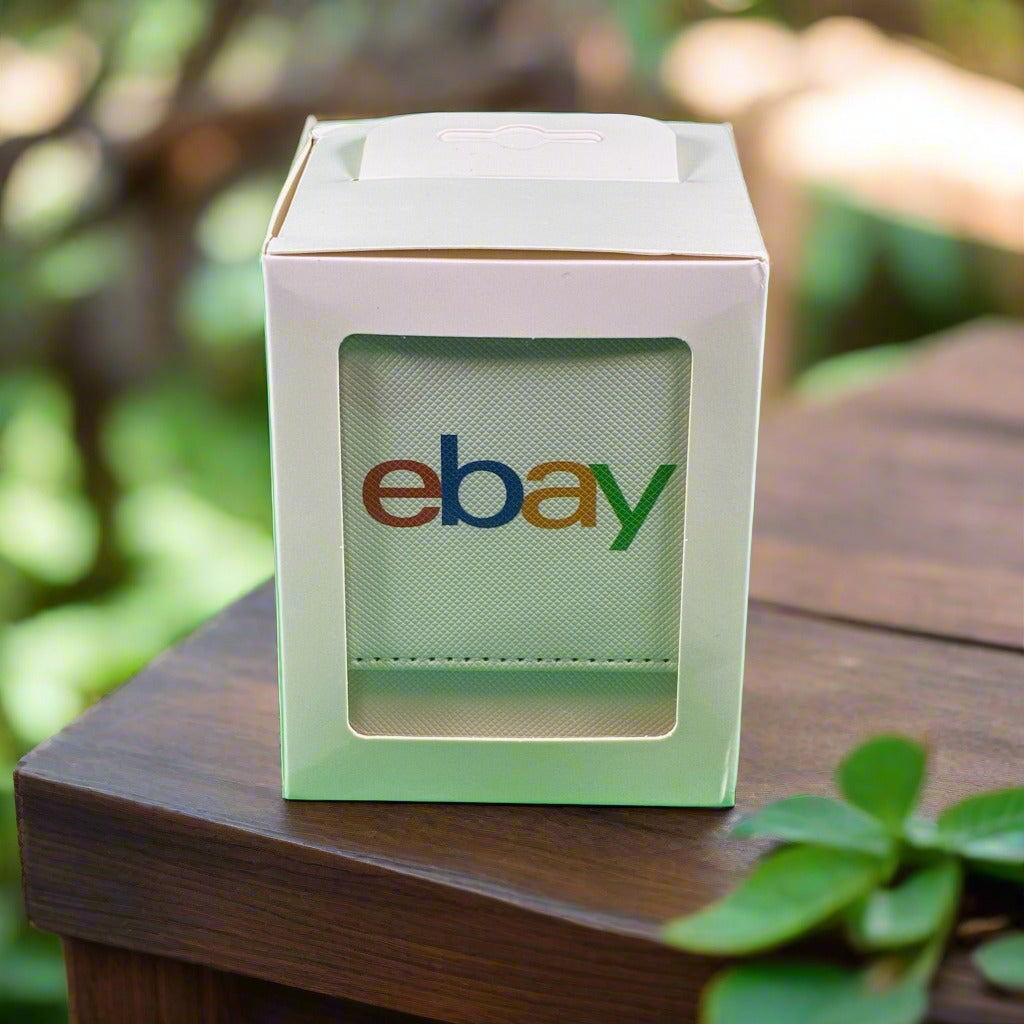 Show off your collector pride with the eBay White Leather Deck Box — a sleek, limited promotional item crafted for card game enthusiasts. Made with smooth white faux leather and accented by the iconic eBay logo, this deck box is ideal for securely storing and transporting your favorite cards in style.