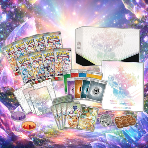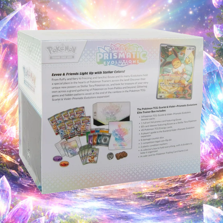 Enter one of the most collector-driven releases of the Scarlet & Violet era with the Prismatic Evolutions Elite Trainer Box. This expansion is centered around Eeveelutions and Terastallized Pokémon, delivering jaw-dropping artwork, extreme rarity, and some of the highest chase values modern Pokémon has seen. 🔥✨
