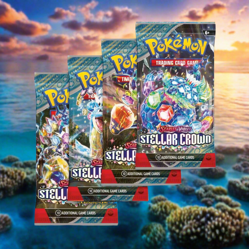 Descend into a world below the surface and discover the true potential of the Terastal phenomenon! The Legendary Pokémon Terapagos takes the throne, joined by Cinderace ex, Lapras ex, and Galvantula ex, all wielding brilliant new powers as Stellar Tera Pokémon ex. The newly discovered Hydrapple ex leads even more Pokémon ex into battle, and ACE SPEC cards continue to shake up the game in the Pokémon TCG: Scarlet & Violet—Stellar Crown expansion!