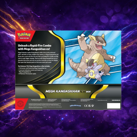 Mega Kangaskhan ex charges into battle with parent and child attacking together! This box is all about big, swingy Mega Evolution power—draw cards, set up your board, then flip for huge damage with Rapid-Fire Combo. It’s a great pickup for players who love explosive turns and collectors who want a bold promo and an impressive jumbo card for their display.